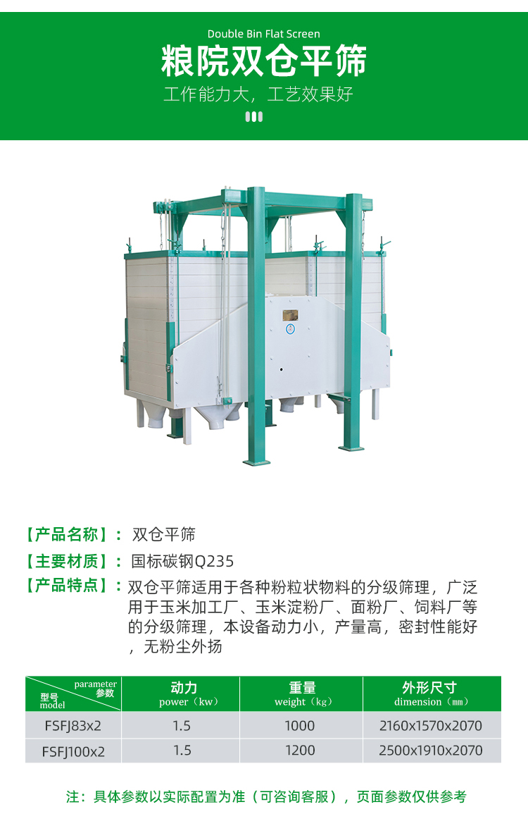 FSFS系列雙倉平篩適用于各種粉粒狀物料的分級篩理,廣泛用于玉米加工廠、玉米淀粉廠、面粉廠、飼料廠等的分級篩理;是非常理想的顆粒物料分級篩理設(shè)備。本設(shè)備動(dòng)力小,產(chǎn)量高,密封性能好,無粉塵外揚(yáng)。