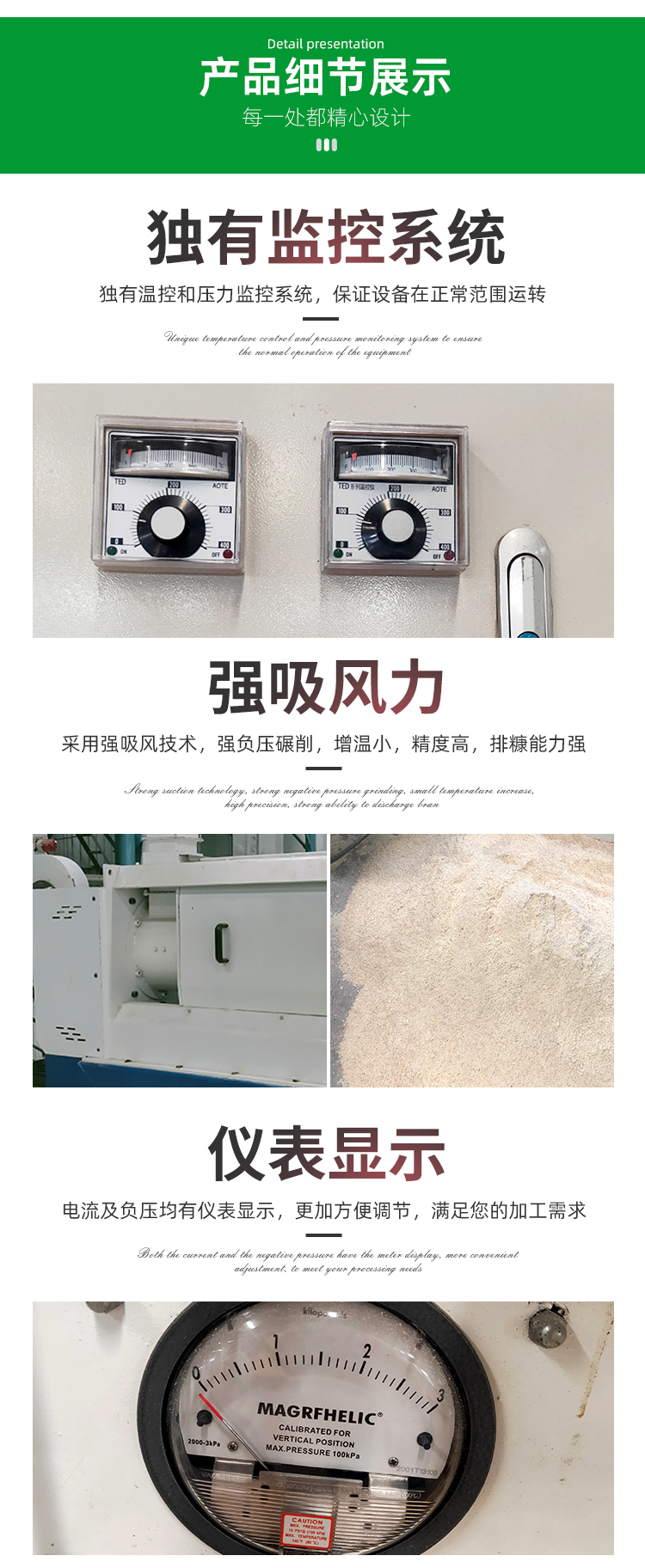2、采用強(qiáng)吸風(fēng)技術(shù),強(qiáng)負(fù)壓碾削,增溫小,精度高,排糠能力強(qiáng);