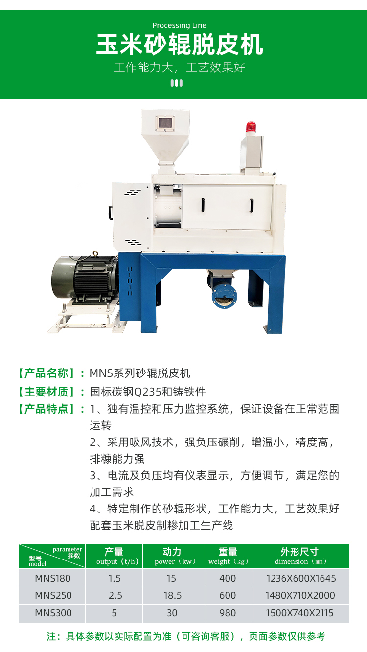 MNS系列玉米砂輥脫皮機(jī)是玉米加工廠干法脫皮的理想設(shè)備,本設(shè)備脫皮效果好,耗能低,產(chǎn)量高,密封性能好,無粉塵外揚(yáng)。