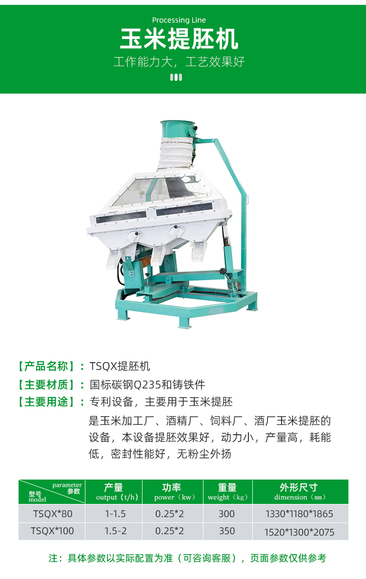 TSQX系列提胚機(jī)是玉米加工廠、酒精廠、飼料廠、酒廠玉米提胚的理想設(shè)備,該設(shè)備提胚效果好,動(dòng)力小,產(chǎn)量高,耗能低,密封性能好,無粉塵外揚(yáng)。