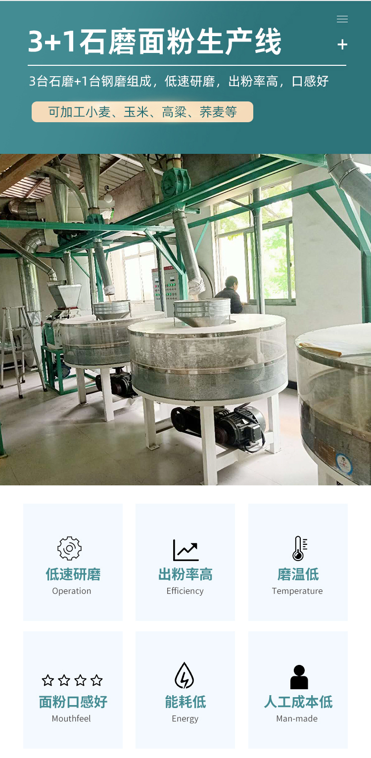 3+1組石磨面粉加工成套設(shè)備轉(zhuǎn)速低、磨溫低,不會(huì)破壞小麥中的營養(yǎng)物質(zhì),改設(shè)備有效提高出粉率,適用于大型石磨面粉廠的加工,磨出來的面粉是天然面粉。不含任何添加劑,口感好,營養(yǎng)價(jià)值高。用石磨磨粉,能夠避免大型機(jī)械生產(chǎn)面粉時(shí)高溫高壓對(duì)面粉營養(yǎng)的破壞,從而更多地保留了面粉中的營養(yǎng)成分。